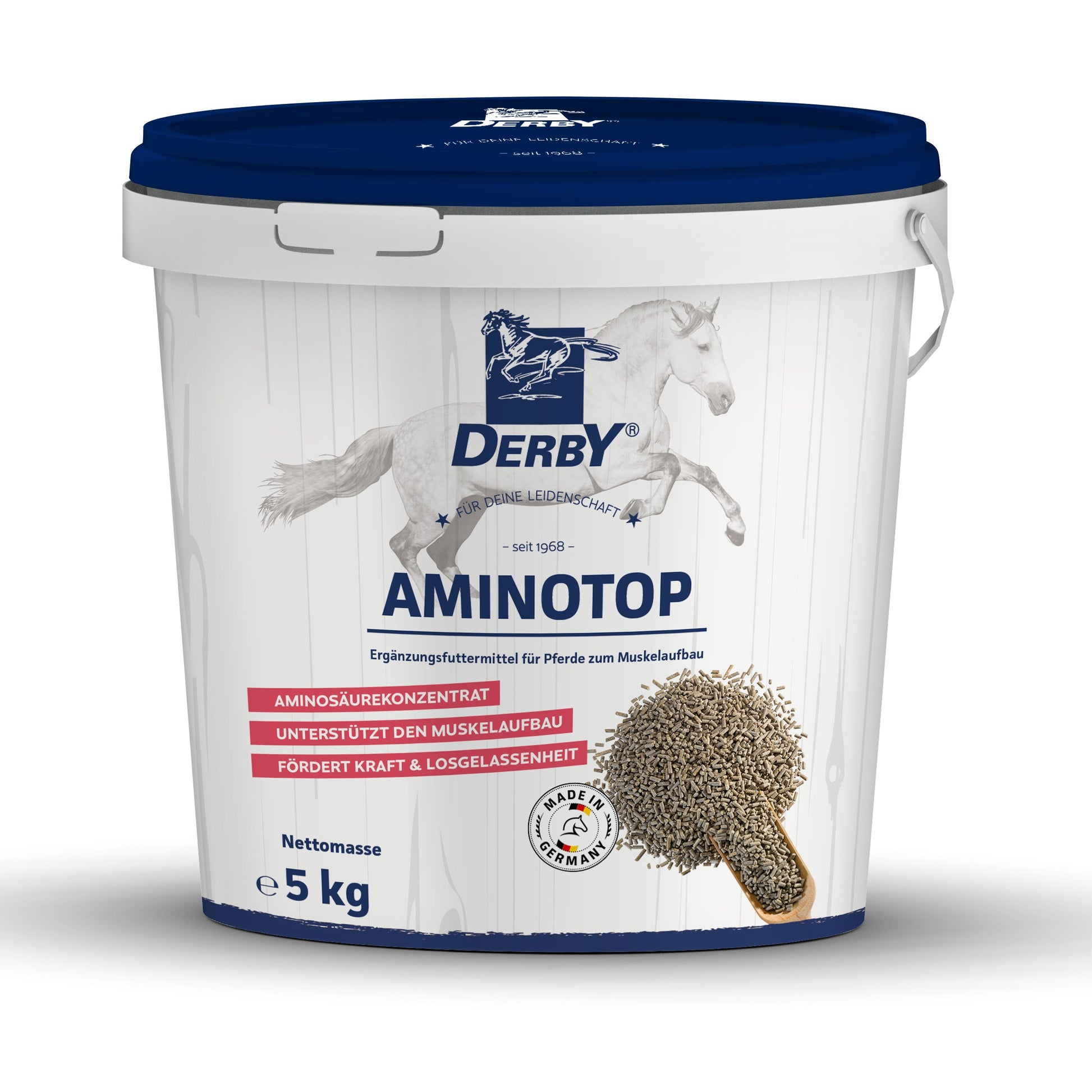 DERBY® Aminotop liefert wertvolle essenzielle Aminosäuren. Diese werden unter anderem zum Muskelaufbau benötigt. Aber auch für Zuchtstuten, um das Wachstum und die Entwicklung des ungeborenen Fohlens zu unterstützen. DERBY® Aminotop kann die bestehende Ration gezielt ergänzen. Es kann problemlos in eine bestehende Ration aufgenommen werden, da es keine Vitamine und Mineralstoffe enthält. Durch die kleine Fütterungsmenge eignet sich DERBY® Aminotop auch sehr gut für Pferde, die nur einmal täglich gefüttert werden können.