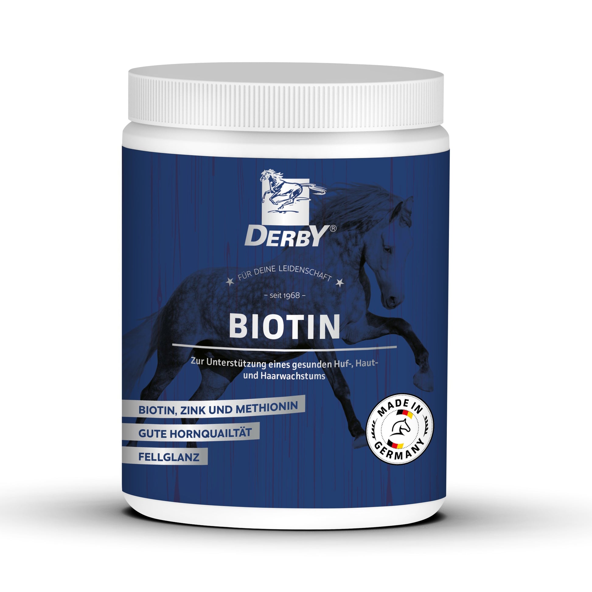 DERBY® Biotin ist ein Ergänzungsfuttermittel für Pferde. Es beugt ernährungsbedingten Mangelerscheinungen vor allem an Huf, Haut und Haaren vor, die durch zu geringe Gehalte an Biotin, Methionin und Zink im Futter entstehen. DERBY® Biotin liefert wichtige Nährstoffe für das Hufwachstum und die Hornstruktur.