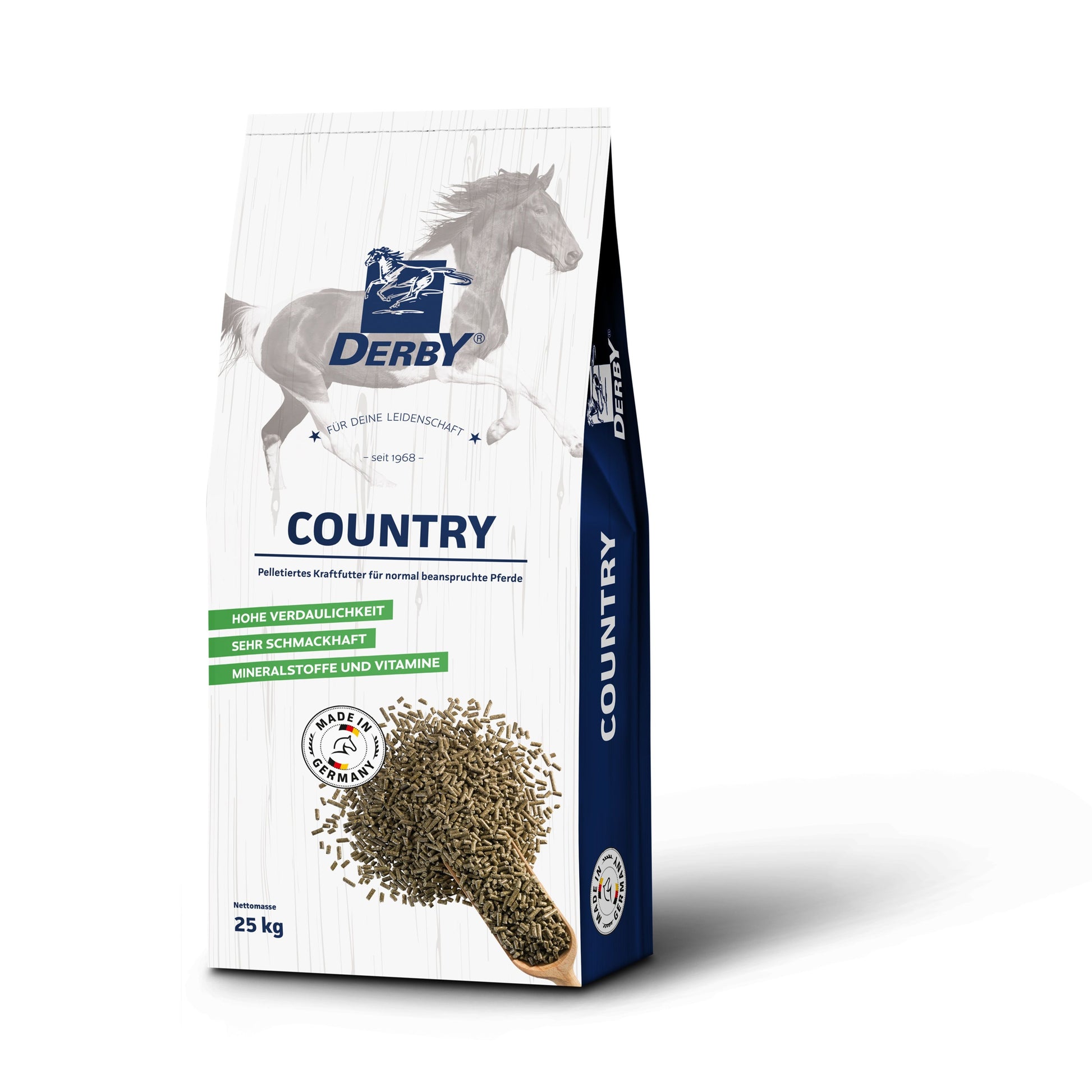 DERBY® Country ist ein Ergänzungsfuttermittel für Pferde. Es ist vollwertig vitaminiert und mineralisiert und eignet sich ideal als alleiniges Kraftfutter zu ausreichend Heu oder Heulage. Es ist leicht verdaulich und liefert dem Pferd genug Energie für leichte bis mittlere Arbeit. Durch den hohen Gehalt an Luzerne ist DERBY® Country sehr schmackhaft und enthält wertvolle Aminosäuren, die den Muskelaufbau unterstützen.