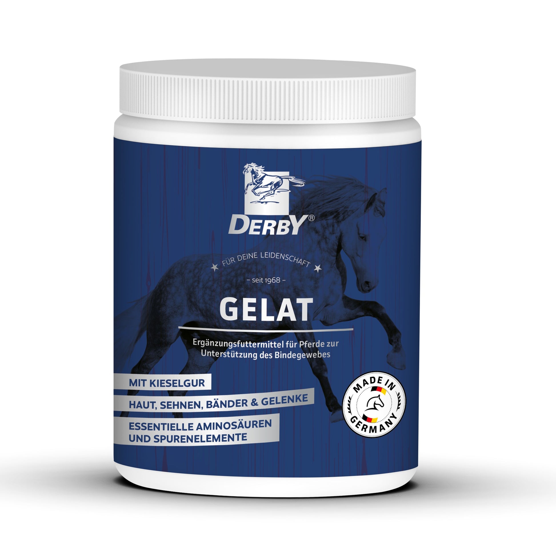 DERBY® Gelat ist ein Ergänzungsfuttermittel für Pferde. Es dient der gezielten Versorgung des Pferdes mit den lebenswichtigen Aminosäuren Lysin, Threonin und Methionin in Verbindung mit Kieselgur. Aminosäuren und Kieselgur werden vom Körper benötigt, um Gewebe aller Art aufzubauen, wie beispielsweise Kollagenfasern der Sehnen und Bänder. Diese Stoffe dienen traditionell dem Aufbau und der Kräftigung des Bindegewebes und der Mineralisierung von Knochengewebe. Mangelsituationen, die durch DERBY® Gelat ausgeglichen werden können, entstehen beispielsweise im Wachstum oder bei besonderen Belastungen des Bewegungsapparates durch Arbeit, Verletzung oder Korrektur der Hufstellung.