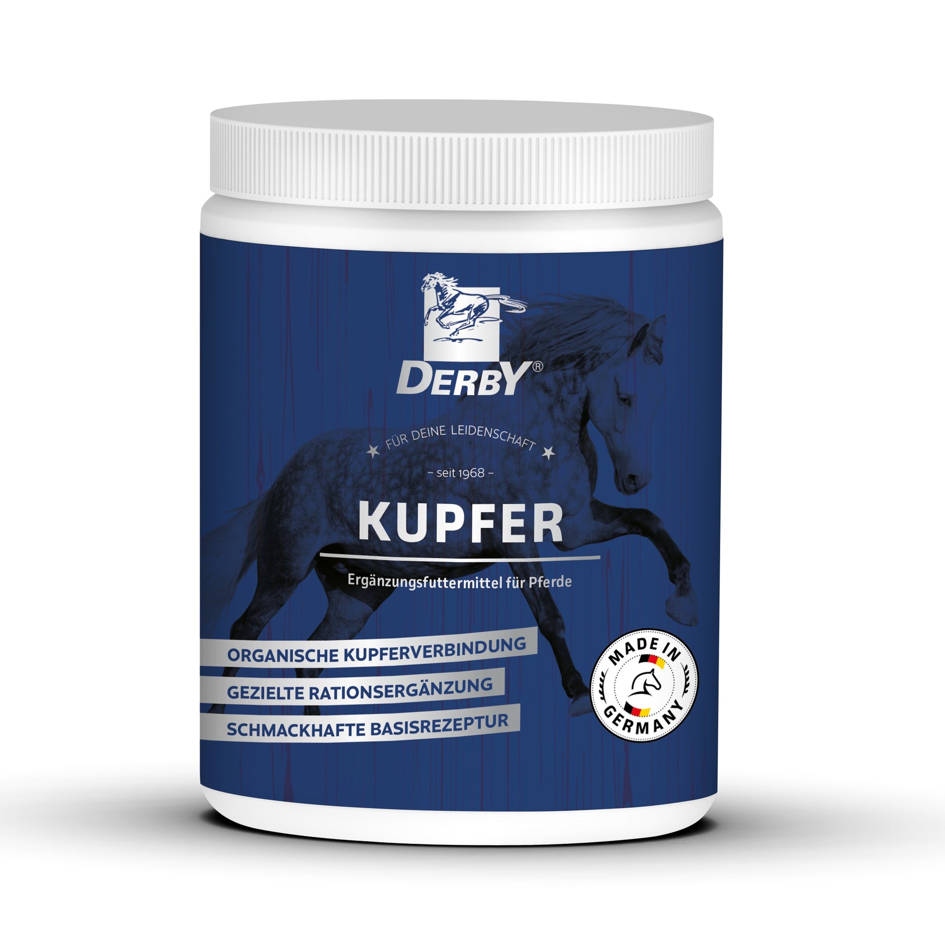 DERBY ® Kupfer ist ein spezielles Ergänzungsfuttermittel für Pferde, das rationsbedingte Mängel an Kupfer ausgleicht. Durch die organische Bindungsform kann das Kupfer gut vom Pferd aufgenommen werden. Kupfer übernimmt im Körper unter anderem eine Funktion als Radikalfänger im Stoffwechsel. Dadurch spielt es eine wichtige Rolle bei der Stressresistenz und im Immunsystem. Eine ausgewogene Versorgung mit Kupfer ist für tragende Stuten von großer Bedeutung.