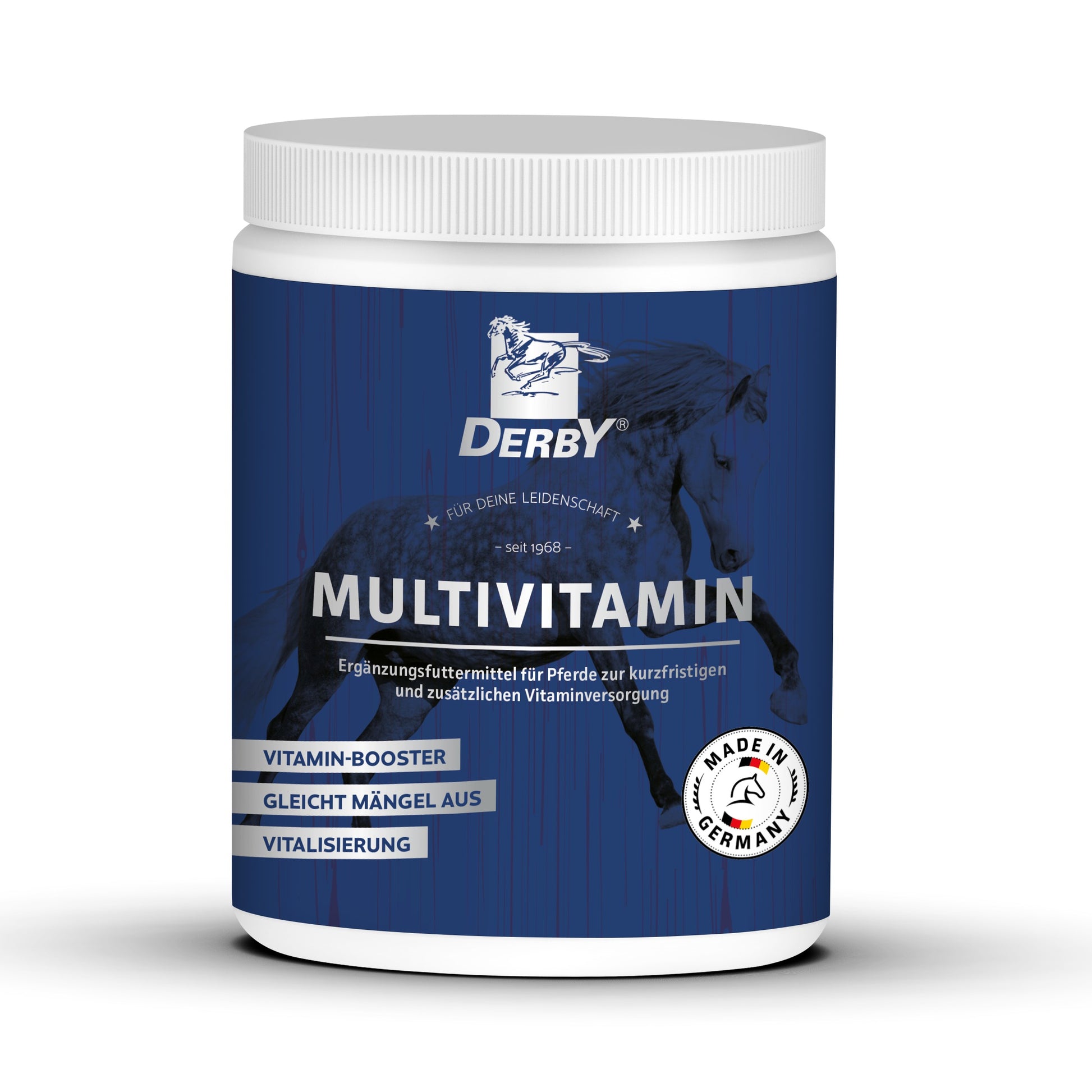 DERBY® Multivitamin ist ein Ergänzungsfuttermittel für Pferde zur kurzfristigen und zusätzlichen Vitaminversorgung. Durch die Lagerung von Grundfutter werden Vitamine abgebaut, sodass es gerade im Winter zu Mängeln kommen kann. DERBY Multivitamin beugt diesem Mangel vor und unterstützt so die Fitness und das Wohlbefinden Ihres Pferdes.