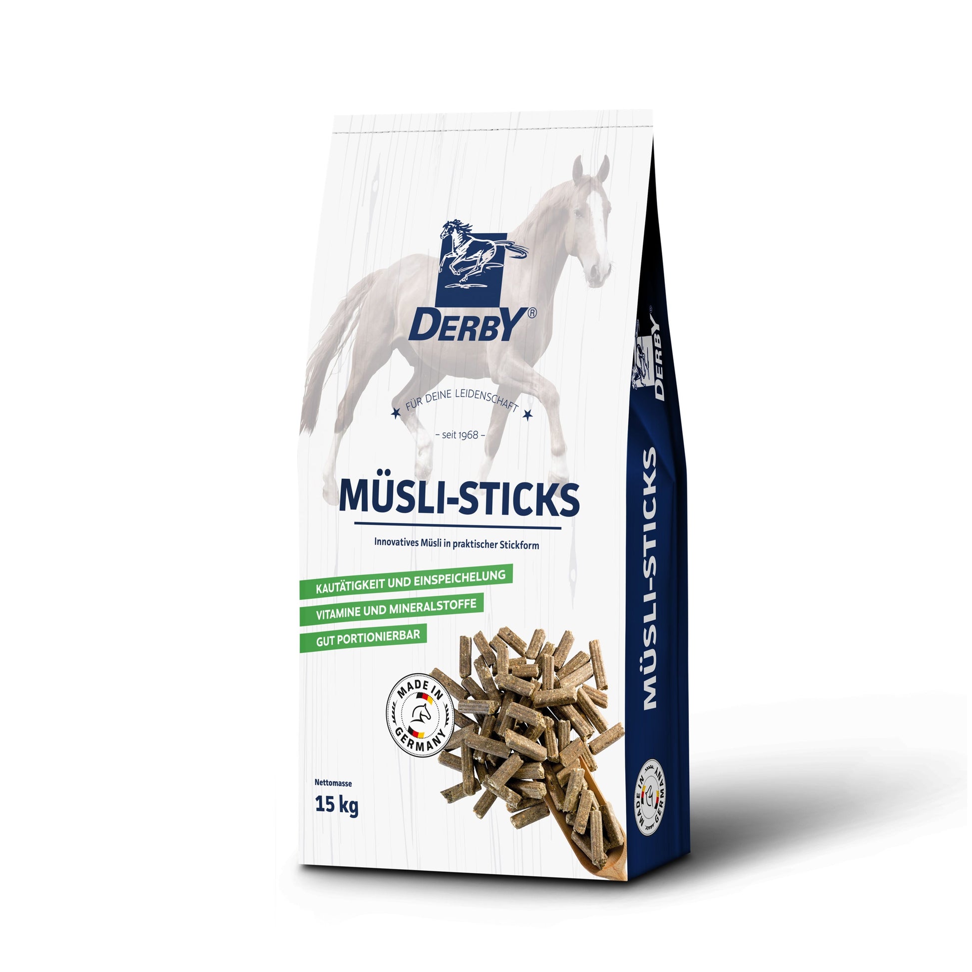 DERBY® Müsli-Sticks sind ein Ergänzungsfuttermittel für Pferde. Die DERBY® Müsli-Sticks vereinen die positiven Eigenschaften von herkömmlichen Pellet- und Müsliprodukten. Dank der speziellen DERBY® Verfahrenstechnologie können die enthaltenen Komponenten, unter Beibehaltung der natürlichen Struktur, zu einem Stick verarbeitet werden. Dadurch bleiben faserreiche Bestandteile erhalten, was die Kautätigkeit und Speichelbildung erhöht. Die vermehrte Speichelbildung fördert die Magengesundheit. Darüber hinaus lassen sich die Müsli-Sticks gut portionieren. DERBY® Müsli-Sticks ernähren Sport- und Freizeitpferde nach den neusten wissenschaftlichen Erkenntnissen.