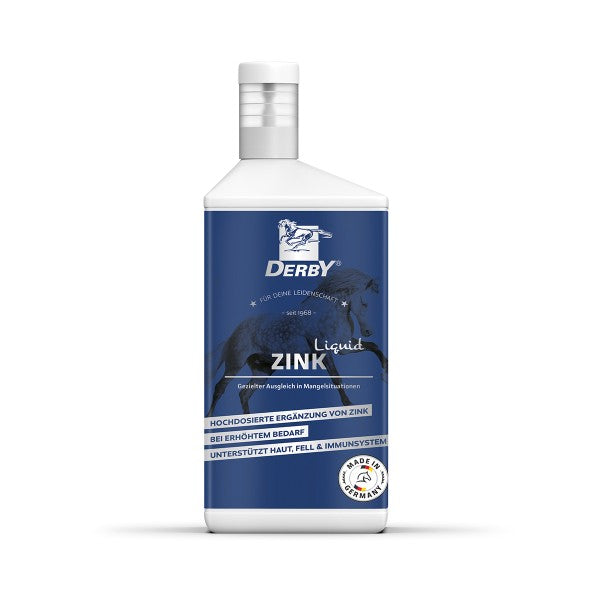 DERBY® Zink liquid ist ein Ergänzungsfuttermittel für Pferde, das dem gezielten Ausgleich von Zinkmangel in der Ration dient. DERBY® Zink liquid kombiniert hochdosierte organische und anorganische Zinkverbindungen. Das Spurenelement ist Bestandteil von Enzymen und steuert als Cofaktor wichtige Stoffwechselvorgänge. Hervorzuheben ist auch die Beteiligung von Zink an der Zellneubildung und der Zellerneuerung. In Mangelsituationen können durch DERBY® Zink liquid vor allem der Hautstoffwechsel und das Fellwachstum positiv beeinflusst werden. Aber auch das Immunsystem kann durch die Fütterung von DERBY® Zink liquid unterstützt werden.