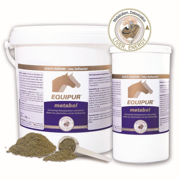 EQUIPUR - metabol unterstützt die Leberfunktion bei chronischer Leberinsuffizienz (gestörter Leberstoffwechsel) sowie beim equinen metabolen Syndrom (EMS). Hochwertige Biokatalysatoren und Antioxidantien schützen die Leber, fördern die schnelle Ausscheidung von Stoffwechselendprodukten und unterstützen die Umwandlung von Futter in leistungswirksame Substanzen.