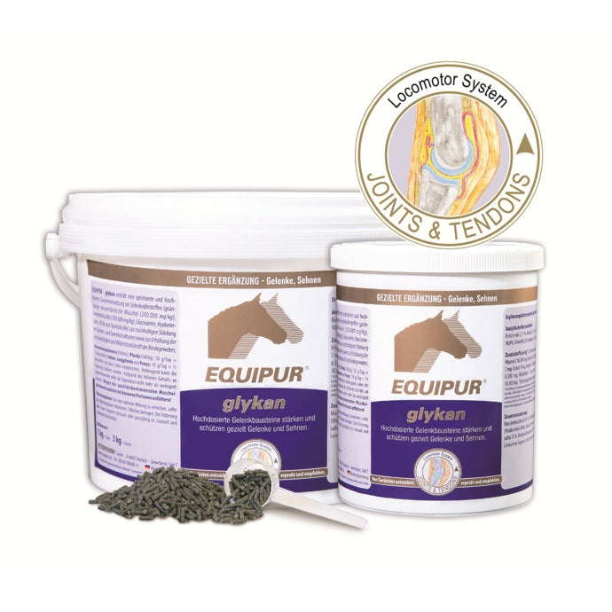 EQUIPUR - glykan enthält eine optimierte und hochdosierte Zusammensetzung an Gelenknährstoffen (grünlippige neuseeländische Muschel (200.000 mg/kg), Chondroitinsulfat (100.000 mg/kg), Glucosamin, Hyaluronsäure, MSM und Teufelskralle) zur nachhaltigen Stärkung der Sehnen- und Gelenkstrukturen sowie zur Erhöhung der Geschmeidigkeit und Widerstandskraft des Bindegewebes.