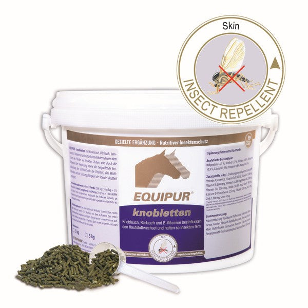 EQUIPUR - knobletten mit Knoblauch, Bärlauch, Leinsamen, B-Vitaminen und natürlichen Kräutern dienen dem Schutz des Pferdes vor Insekten. Zudem wird durch die Förderung der Verdauung sowie die tiefgreifende Entschlackung des Stoffwechsels die Vitalität, das Wohlbefinden und die Leistungsfähigkeit des Pferdes deutlich gesteigert.
