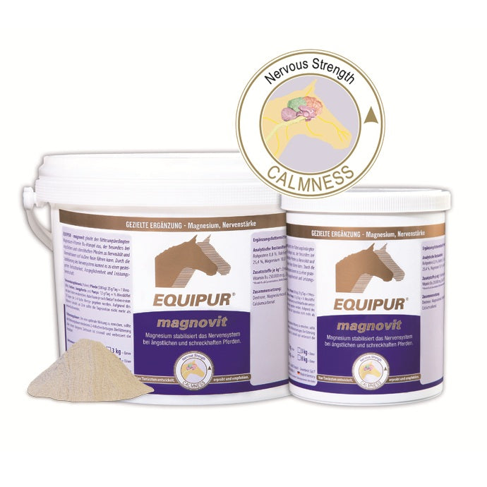 EQUIPUR - magnovit gleicht den fütterungsbedingten Magnesium-Vitamin B12-Mangel aus, der besonders bei ängstlichen und schreckhaften Pferden zu Nervosität und Überreaktionen auf äußere Reize führen kann. Durch die Stabilisierung des Nervensystems kommt es zu einer gesteigerten Belastbarkeit, Ausgeglichenheit und Leistungsbereitschaft.
