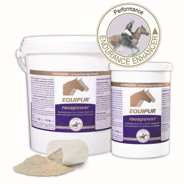 EQUIPUR - racepower mit L-Carnitin bewirkt eine umfassende und langfristige Steigerung des Leistungspotentials des Pferdes. Die Aktivierung des Muskelstoffwechsels führt zu einer Zunahme der Energiegewinnung sowie einem optimalen Aufbau und Schutz der Muskelfasern. Der beschleunigte Abbau von Milchsäure sowie die verbesserte Blutbildung tragen zur Verkürzung der Regenerationsphase bei. Somit wird das Pferd in die Lage versetzt, auf Dauer Spitzenleistungen zu erbringen.