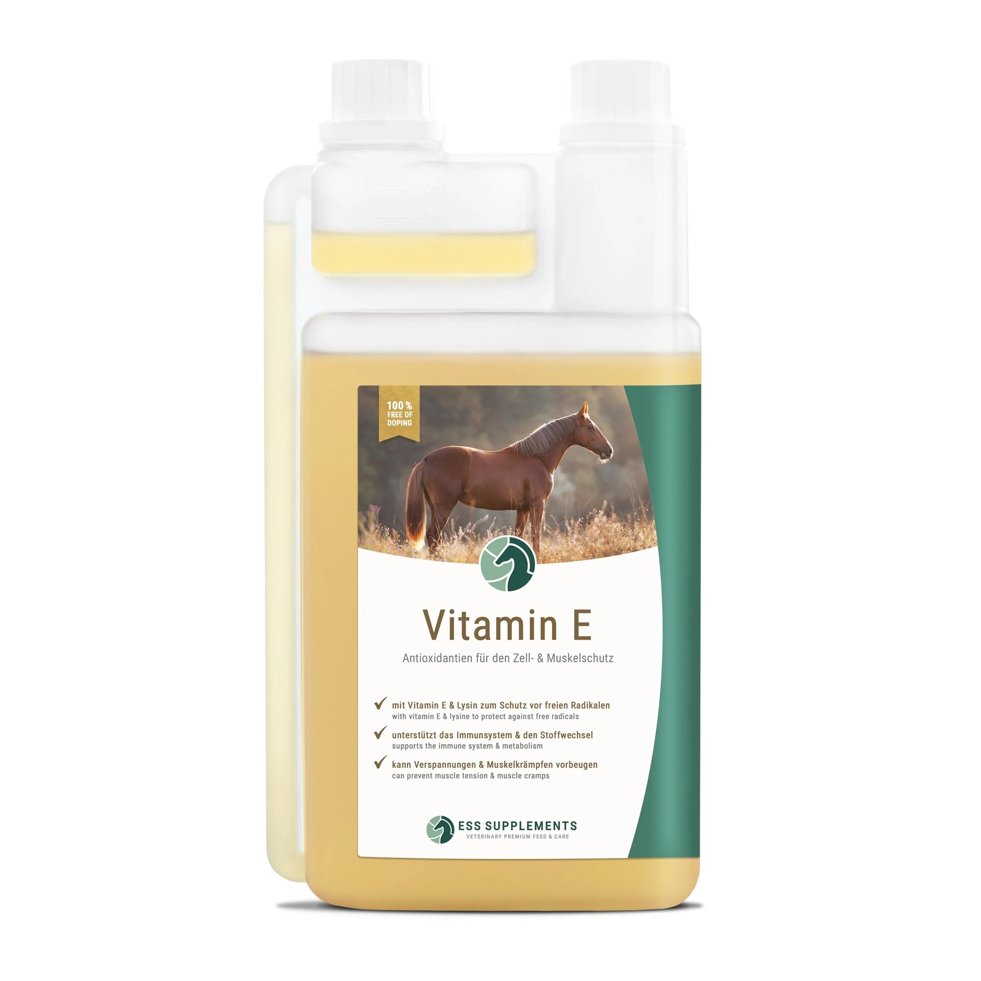 ESS Vitamin E stellt dem Pferd eine schnell verfügbare Zusammenstellung aus verschiedenen Vitamin E-Quellen und der Aminosäure Lysin zur Verfügung, um die (Muskel-)Zellen aktiv zu schützen, Verspannungen vorzubeugen, den Muskelaufbau zu fördern und die körpereigenen Abwerhkräfte zu stärken.