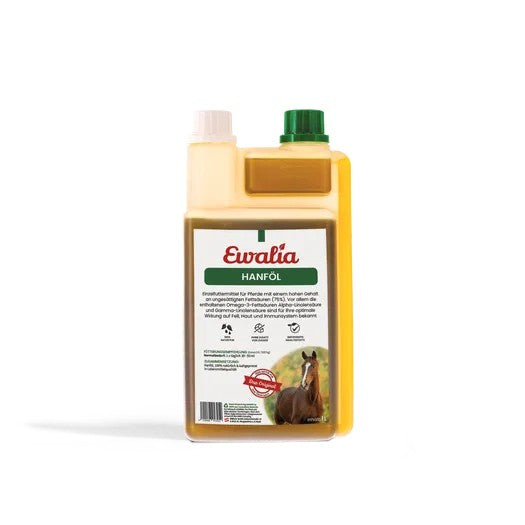 Das EWALIA Hanföl für Pferde ist ein Einzelfuttermittel mit einem hohen Gehalt an ungesättigten Fettsäuren, zur Förderung der Haut- und Fellgesundheit. Die dreifach ungesättigte Omega-6-Fettsäure Gamma-Linolensäure kann sich günstig auf entzündliche Prozesse im Körper auswirken.